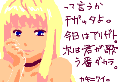 カインズホームで買い物。 買い慣れてるなぁ~って、後ろで見てた。 カラオケ。 「うた年齢」ってのがあって、若い人がよく歌う歌を歌うと低くなり、年配の人がよく歌う歌を歌えば高くなるらしい。 何故か海老さんがうた年齢を高くしようと古めの歌うたってた。 海老さんは色んな歌知ってて関心してしまいます。ほんとに。 自分は曲名だとほとんどわからないのに歌い始めると思い出す。この曲ってそんなタイトルだったんだ!って感じに。 トルコ行進曲の替え歌がおもしろかった。 学校終わってからなので長い時間ではなかったけど、本当に楽しかった! PR COMMENTSCOMMENT FORM TRACKBACKSTRACKBACK URL | |