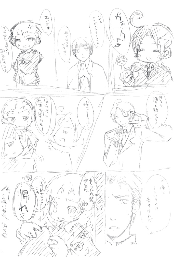 以下セリフです。 伊「なードイツぅ」 「俺のアイス 半分しかないよ?」 独「・・・・ 貸せ」 (カラン・・・) 「これでいいか?」 伊「ドイツ・・・・」 伊「ありがとう!」 (独「フン」) のぁぁぁぁぁー!海老。さんのドイツ素敵過ぎですよ! ありがとう!ありがとう! 右下の ↑おい(笑 は鈴本がほぼ丸投げしたことに怒って海老。さんが書いたコメント。 す、すいませんでした。 ちなみに1コマ目のはコップに入ったジュースとアイスのつもりです。 第一弾先日、海老。様と描いたリレーマンガ第一弾。 告知して良いんだろうか。今日は海老さんと遊びました!