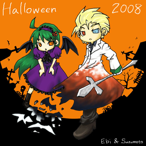 のどもかゆいし。風邪ひいたかな。 合作ハロウィン絵完成しました! なんとか間に合いました。間に合ったよね? 線画を海老様が、塗りを鈴本がやりました。 やっぱり鈴本はセンス無ぇなぁ。 なんか色々ぐちゃぐちゃ塗り潰してたら汚くなってしまいました。 せっかく素敵な絵だったのに台無しだよ。 ↑それでも見たい人はココをクリック ファイルのサイズが大きいかもしれません。 ご了承ください。 海老様、本当にすみません・・・。 明日を乗り切れば連休だ!頑張れ自分。 2008年10月26日髪切ってもらいました。